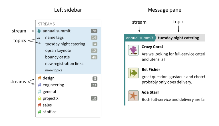 Messages with the same stream and topic are shown together as a conversational thread. Here is what it looks like in Zulip.
