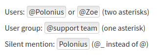 Users: @**Polonius** or @**Zoe|2132** (two asterisks)